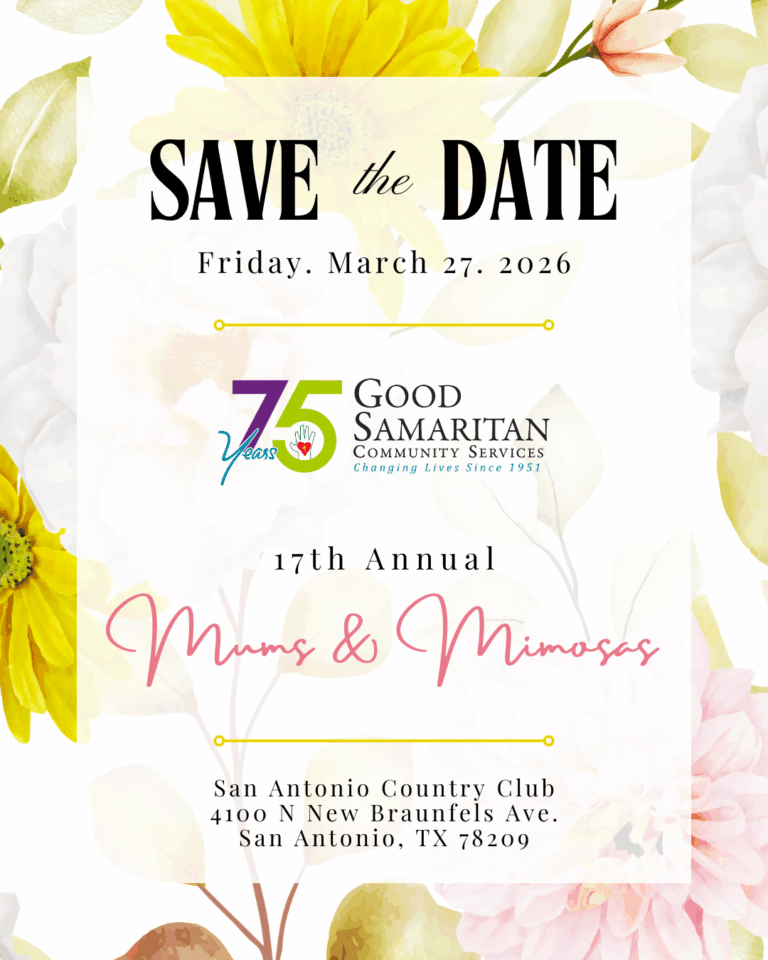 We have much to celebrate this year as we begin to prepare for our 16th Annual Mums & Mimosas luncheon benefiting Good Samaritan Community Services. We invite you to join us and our other honored guests as we gather to hear the GOOD NEWS of the day on Friday, March 27th, 2026, from 11:00 AM to 1:00 PM, at the San Antonio Country Club.